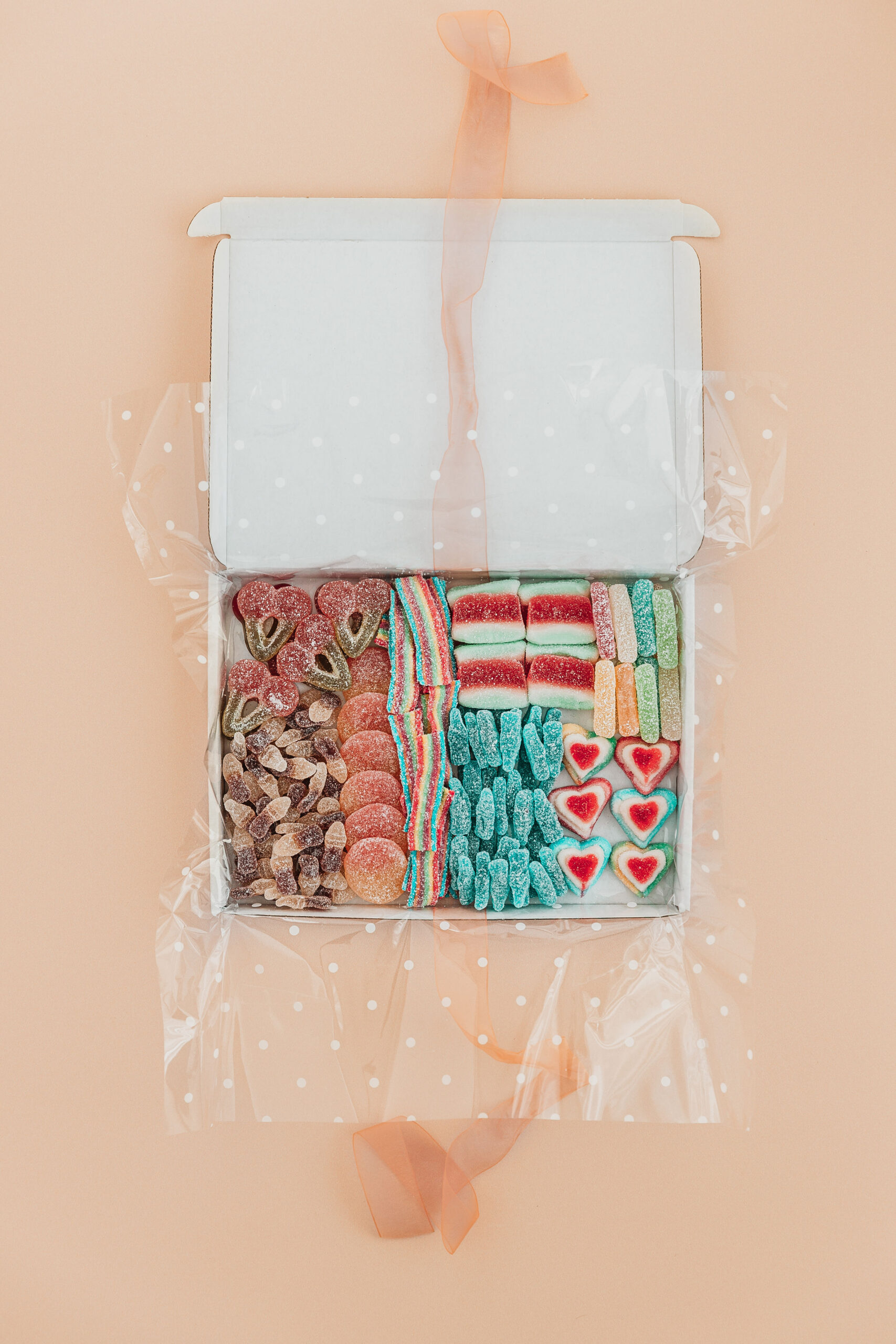 All of our letterbox gifts come beautifully wrapped in biodegradable spotted cellophane that’s tied with peach ribbon, with a spare sweetie bag inside, so that you can keep your sweets fresher for longer (if they last that long!). Enjoy. The Lovely Sweet Co. x